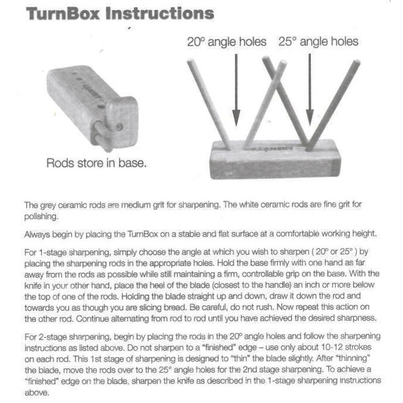 - Includes hardwood turn box with four 5" long alumina ceramic rods (2 medium grit, plus 2 fine grit)