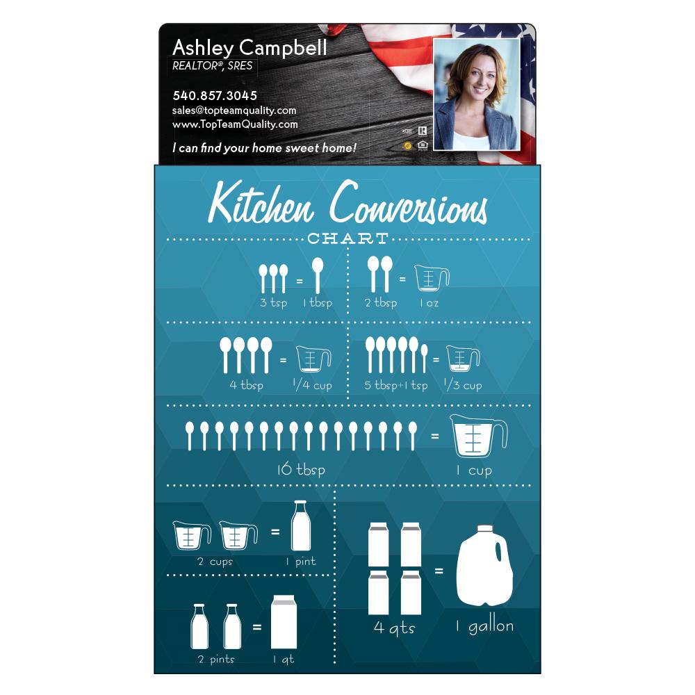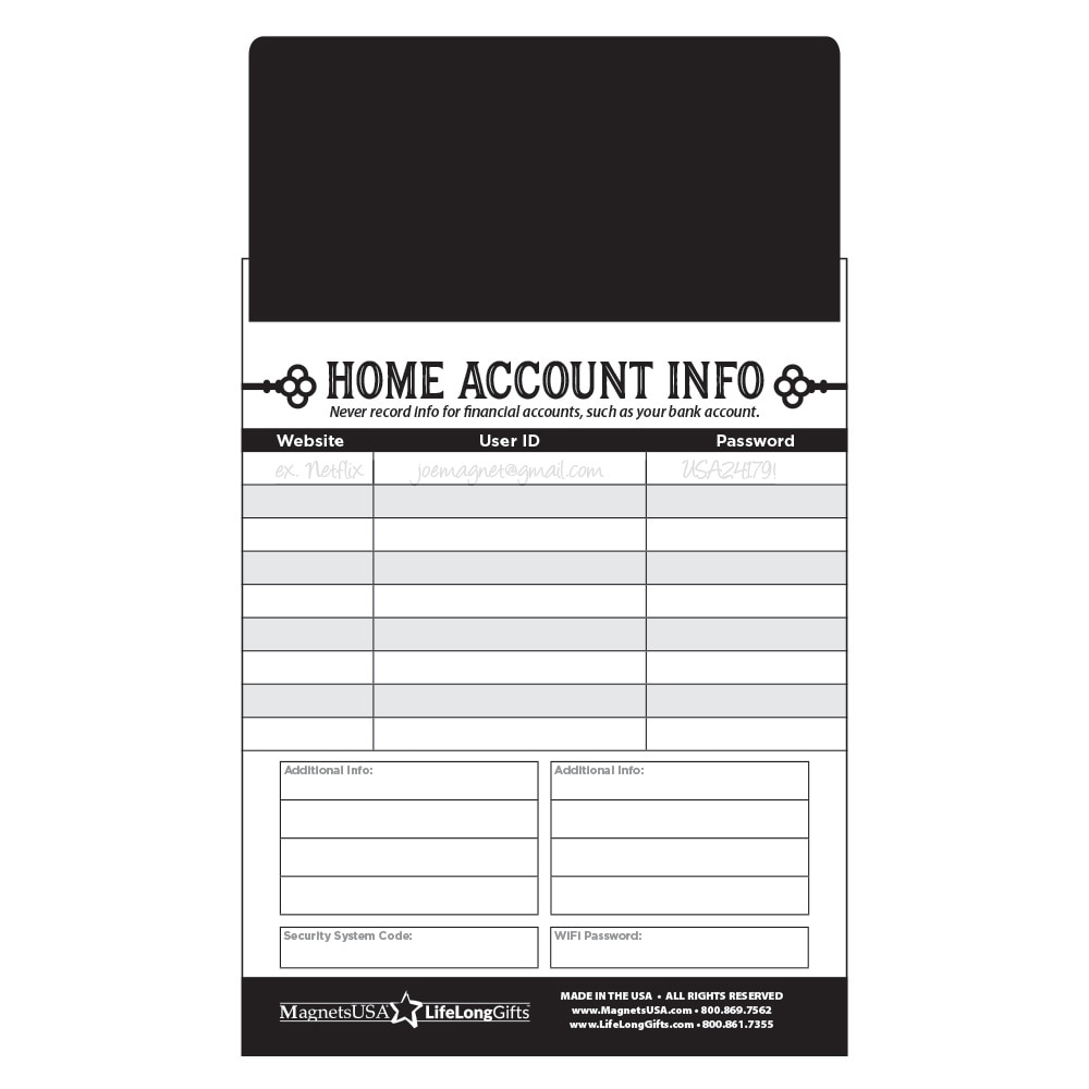 - Backer features kitchen measures chart and Home Account Info write-in chart